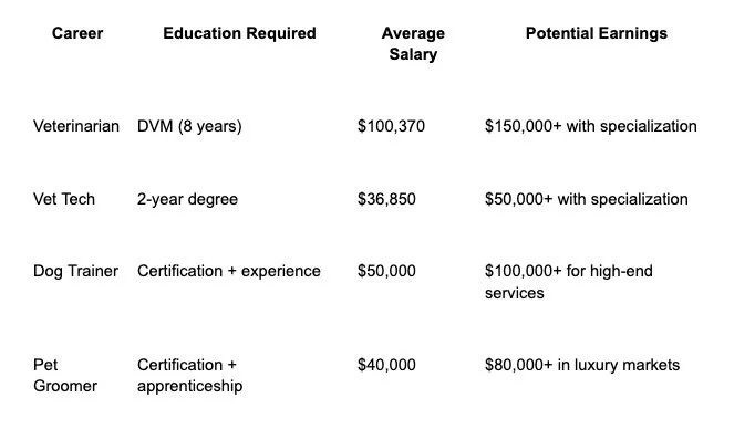 While veterinary careers require years of education and licensing, skilled pet trainers and pet care specialists can sometimes out-earn veterinarians and vet techs—without student debt!